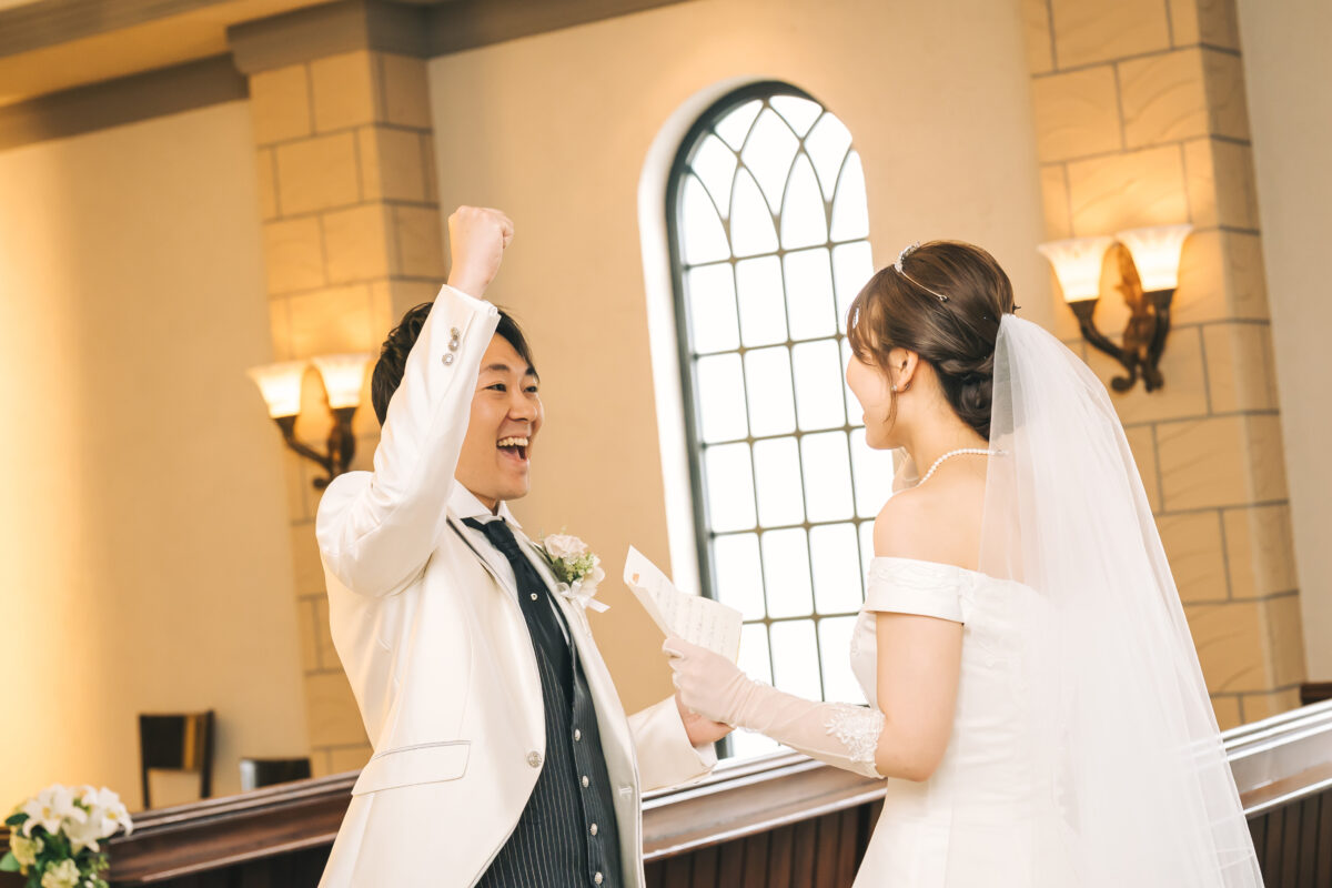 その後の新婦様からのお手紙朗読には少しびっくりした表情をしていましたが、お手紙の締めでいつもの合言葉「イエーイ!」からの握手で、結婚式を楽しむ準備が完了です!